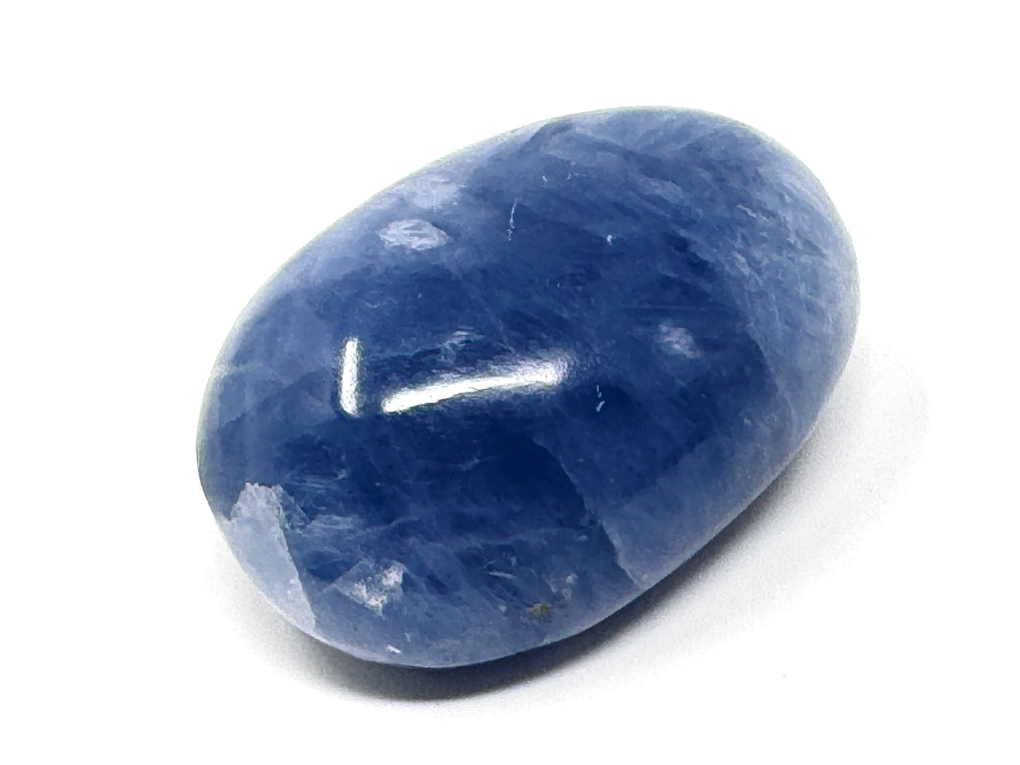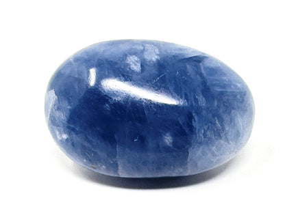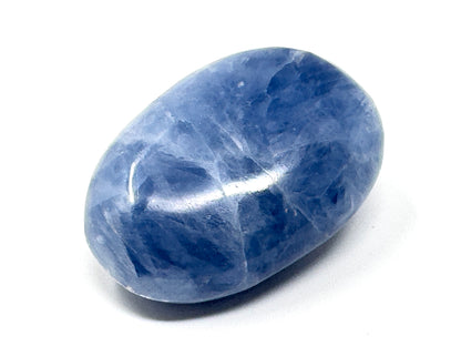 The Polished Blue Calcite Stone has been carefully cut into a smooth oval crystal pebble shape (oval crystal palm stone shape).