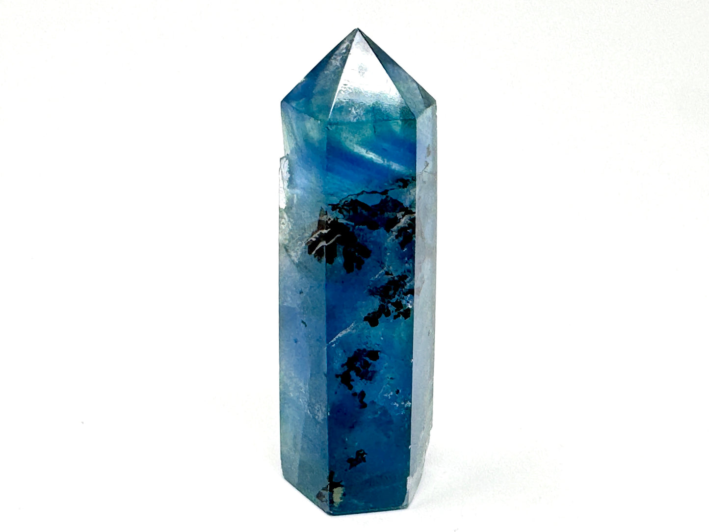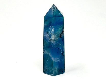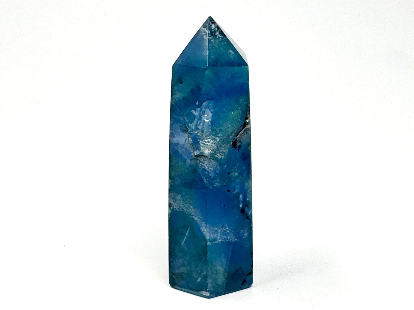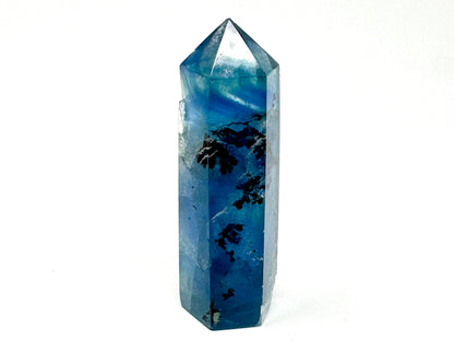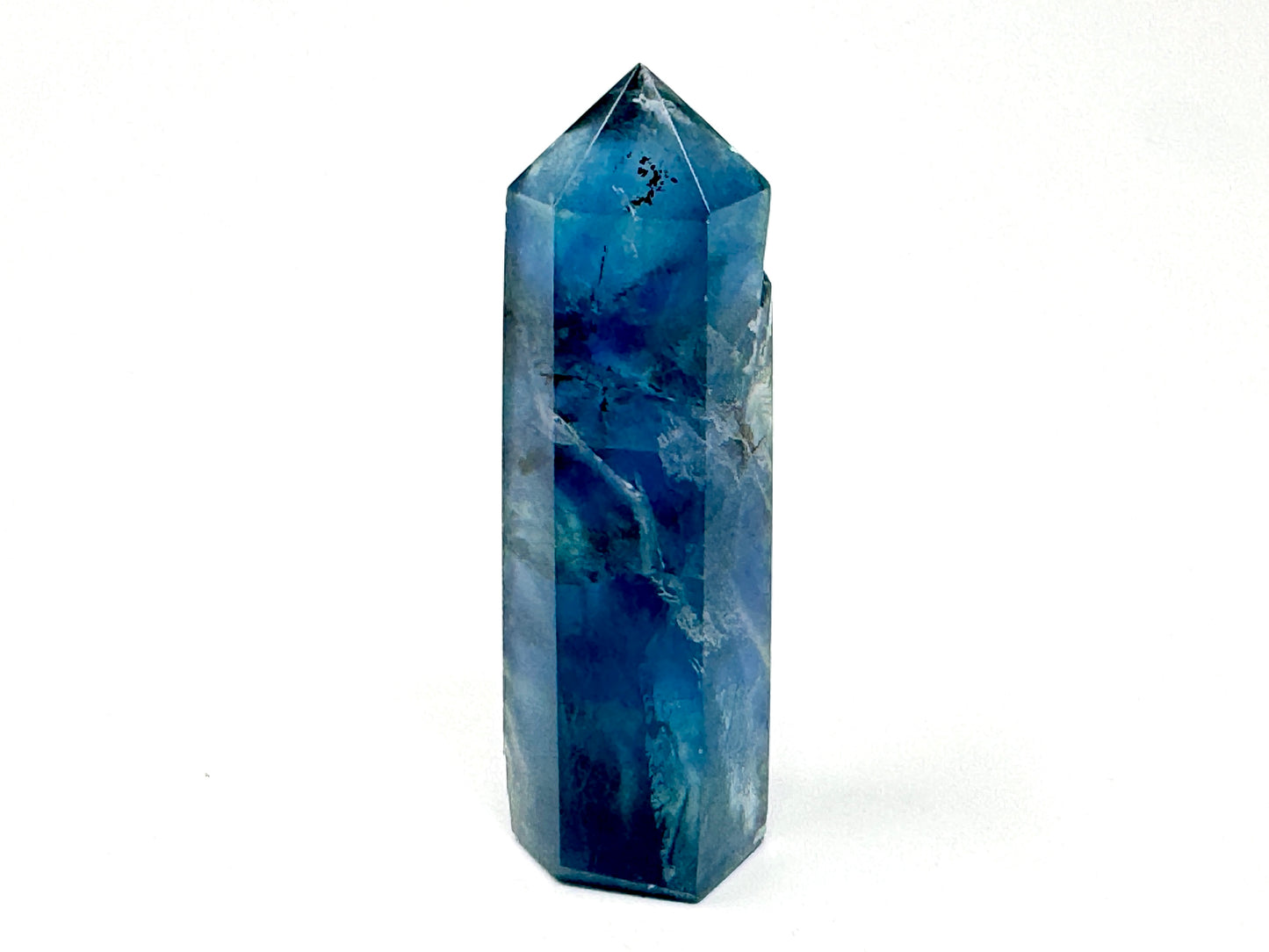 This gorgeous Blue Fluorite Crystal Point measuring 7.8cm tall showcases a gorgeous mix of bright aqua blues, dark blues, and hints of green.