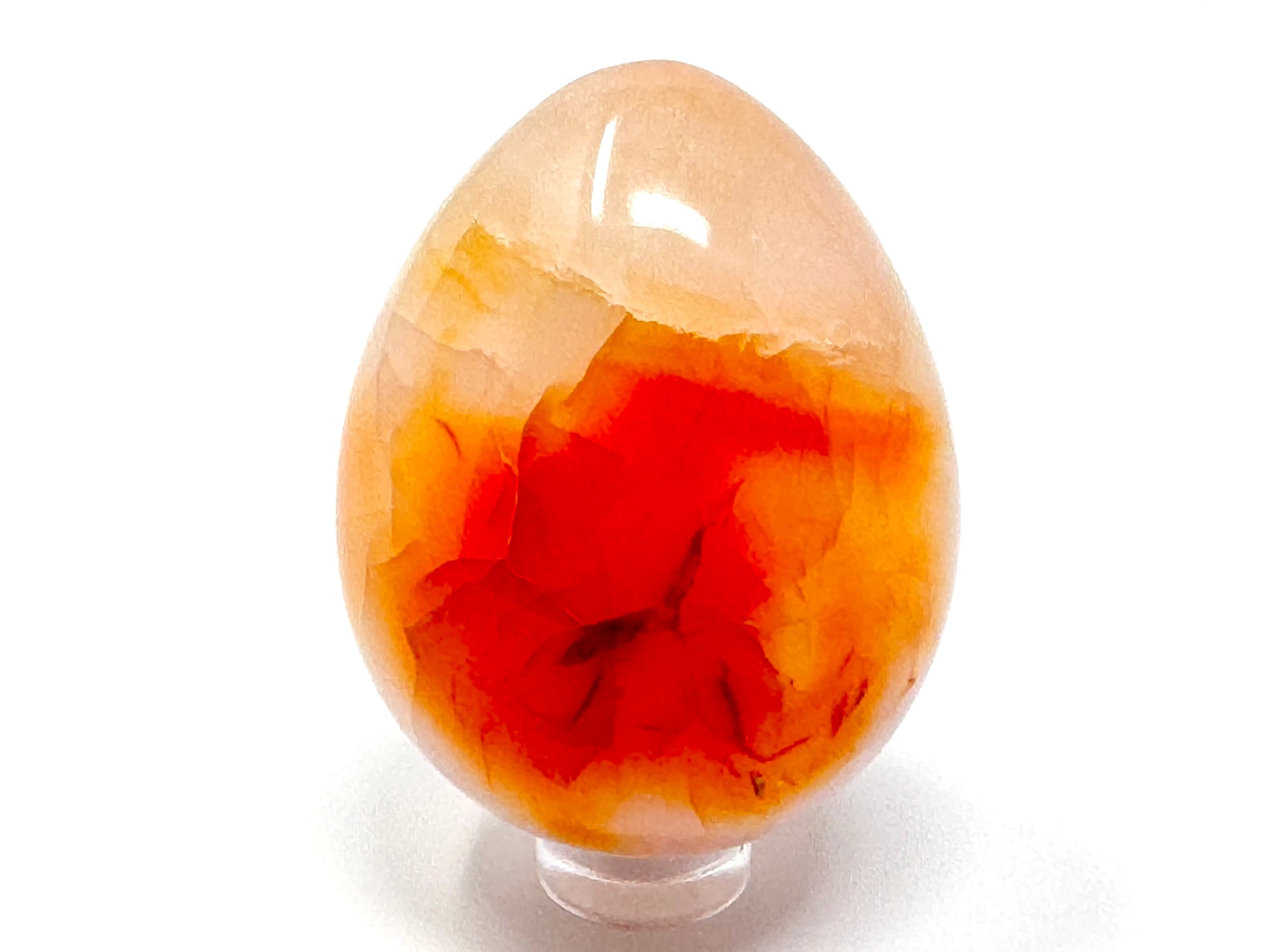 This gorgeous Carnelian Crystal Egg (also known as a Cornelian Crystal Egg, Carnelian Egg Crystal, or Cornelian Egg Crystal) measures 5.6cm tall and displays fierce, fiery orange and red colours, with patterns similar to Sardonyx and Banded Agate.