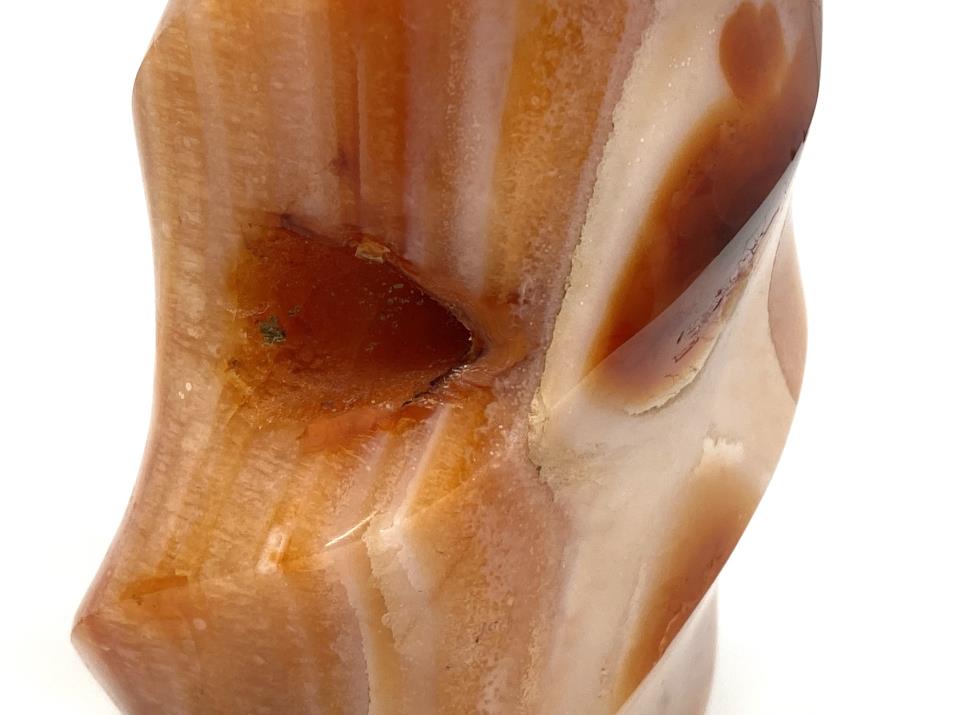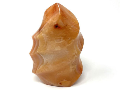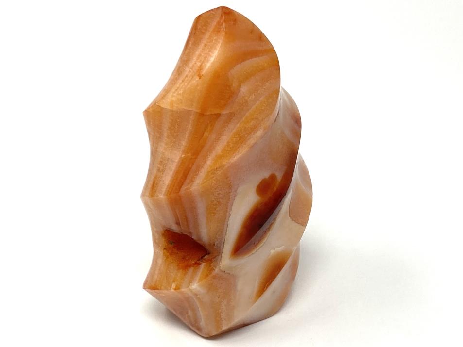 This gorgeous free-standing Large Carnelian Crystal Flame Shape (also known as a Large Cornelian Crystal Flame Shape, Large Carnelian Flame Shape, or Large Cornelian Flame Shape) measures 13.3cm tall and displays fierce, fiery orange and red colours, with patterns similar to Sardonyx and Banded Agate.