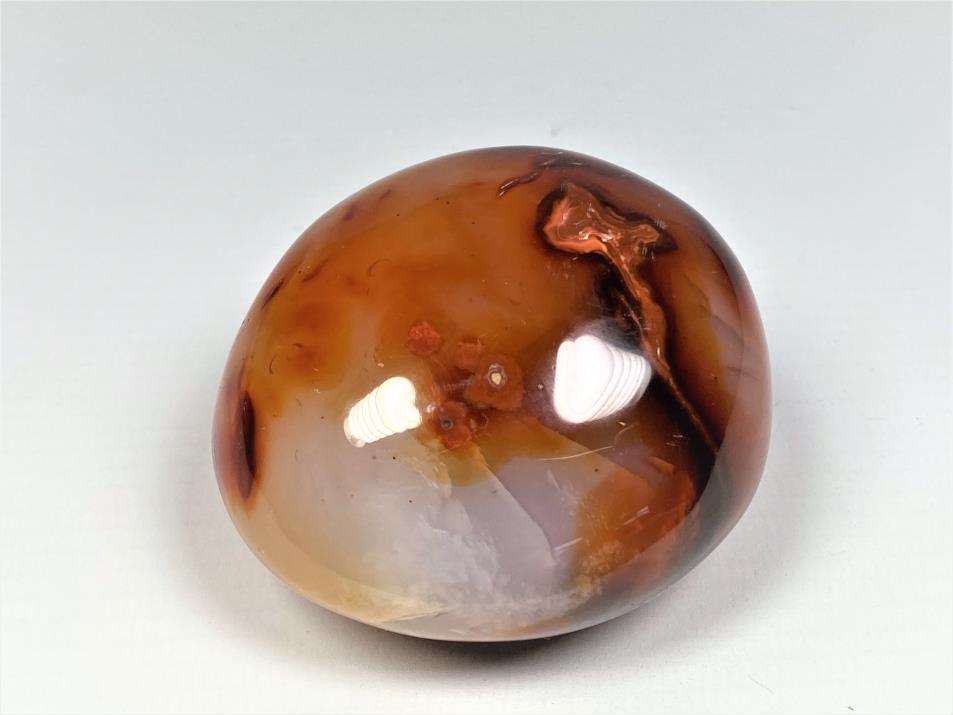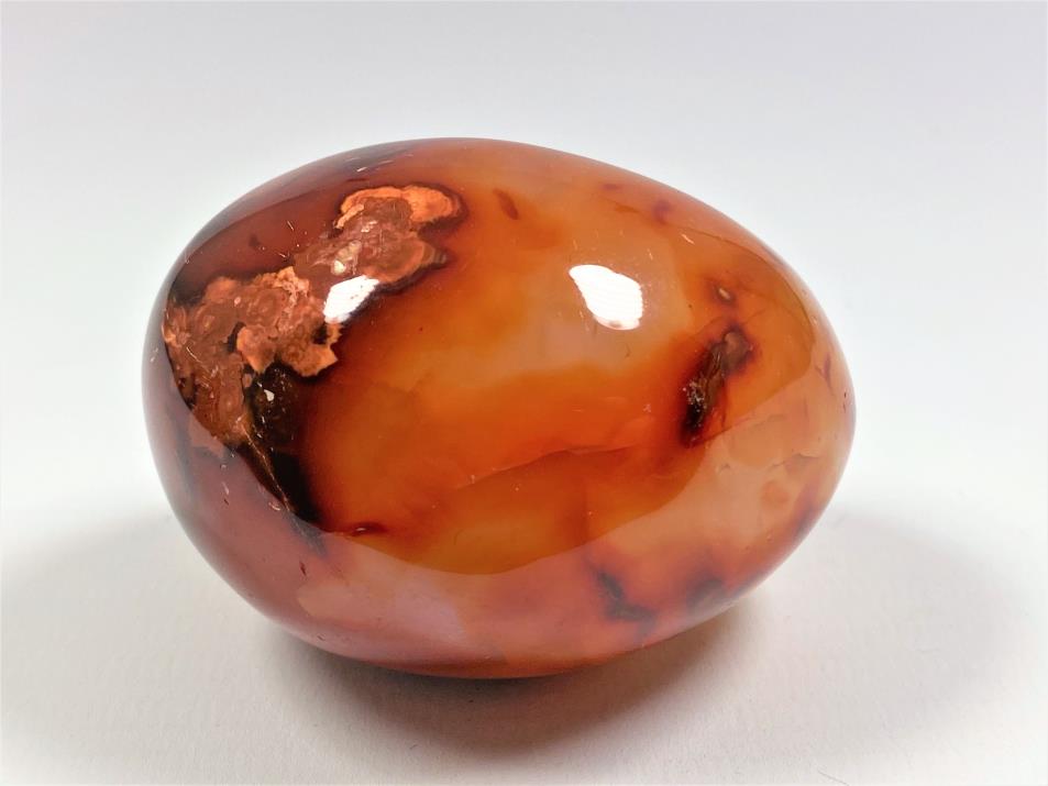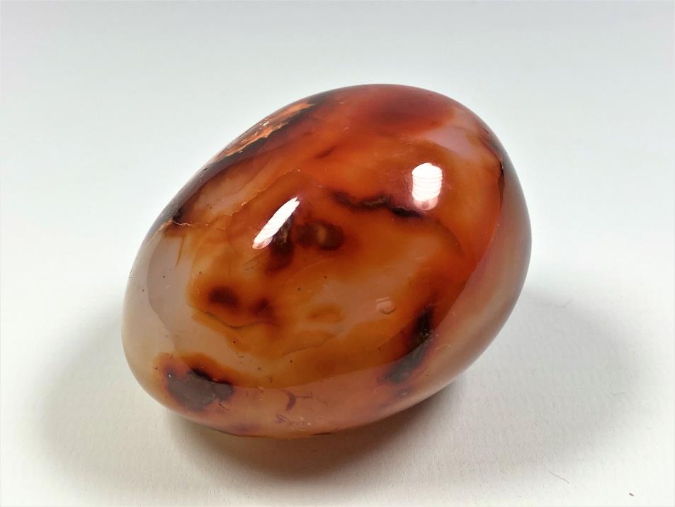 This gorgeous Carnelian Palm Stone (also known as a Carnelian Pebble, Carnelian Crystal Pebble, Carnelian Crystal Palm Stone or Cornelian Palm Stone) measures 6.1cm long and displays fierce, fiery orange and red colours, with patterns similar to Sardonyx and Banded Agate.