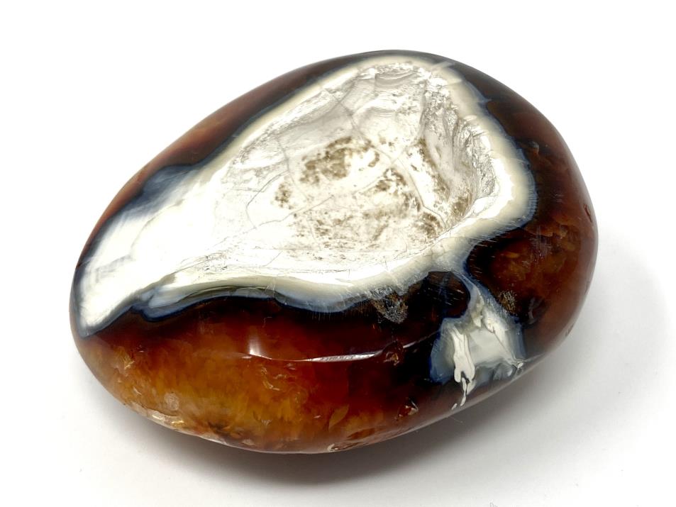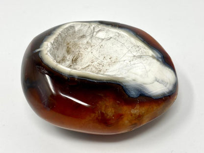 This gorgeous Carnelian Geode Crystal Pebble (also known as a Cornelian Geode Crystal Pebble or Carnelian Geode Crystal Palm Stone) measures 7.2cm long and displays a large open crystal cavity, alongside fierce, fiery orange and red colours, with patterns similar to Sardonyx and Banded Agate.