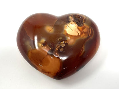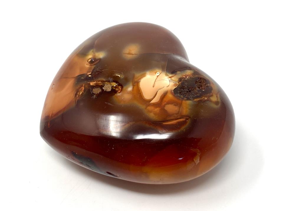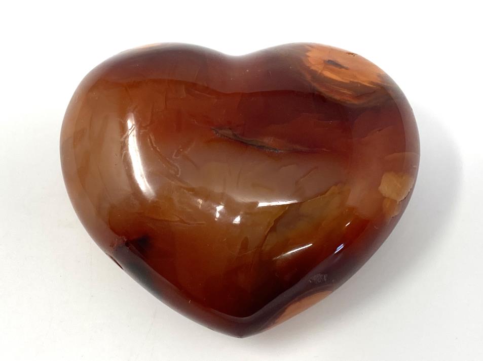 This gorgeous Carnelian Crystal Heart (also known as a Cornelian Crystal Heart, Carnelian Heart Crystal, or Cornelian Heart Crystal) measures 7.6cm wide and displays fierce, fiery orange and red colours, with patterns similar to Sardonyx and Banded Agate.
