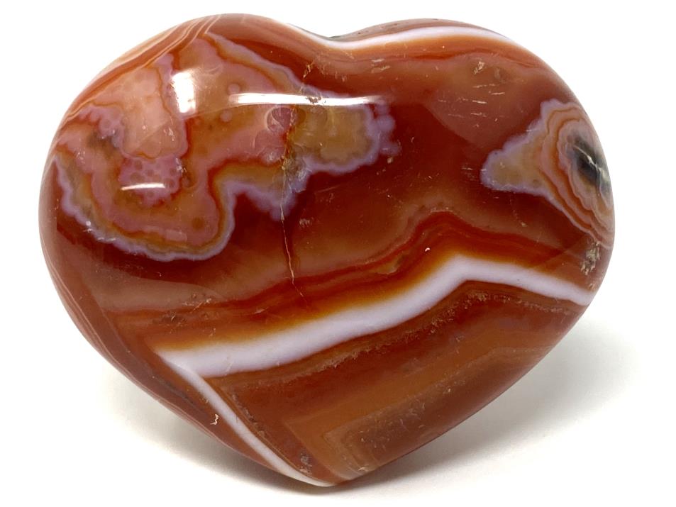 This gorgeous Carnelian Crystal Heart (also known as a Cornelian Crystal Heart, Carnelian Heart Crystal, or Cornelian Heart Crystal) measures 5.3cm wide and displays fierce, fiery orange and red colours, with patterns similar to Sardonyx and Banded Agate.