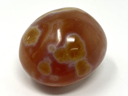 The natural Carnelian Stone (Cornelian Stone) has been carefully cut and polished into a tactile crystal palm stone shape or crystal pebble shape, creating a striking Carnelian Palm Stone.