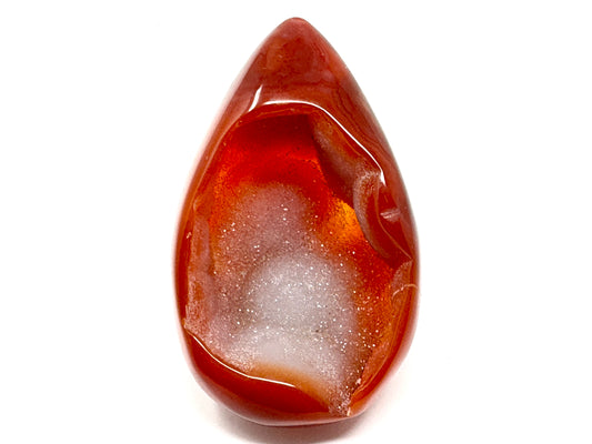 Carnelian is a unique type of red and orange Chalcedony, and the distinctive fiery colours present in Carnelian are caused by iron impurities (iron oxide/ hematite) within the inner Quartz crystal structure.