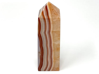 This gorgeous free-standing Large Carnelian Crystal Tower (also known as a Large Carnelian Crystal Obelisk, Large Cornelian Crystal Tower, Large Carnelian Tower, or Large Carnelian Obelisk) measures 15.7cm tall and displays fierce, fiery orange and red colours, with patterns similar to Sardonyx and Banded Agate.