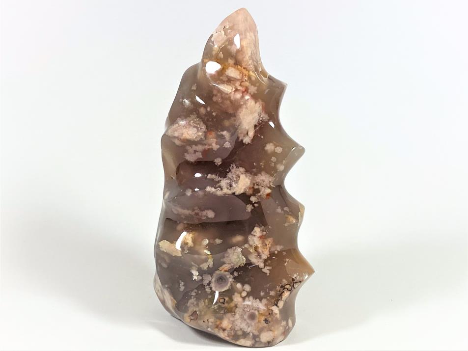 Adorned with pink-cream floral pattern inclusions, this Flower Agate Crystal Flame Shape is truly mesmerising.