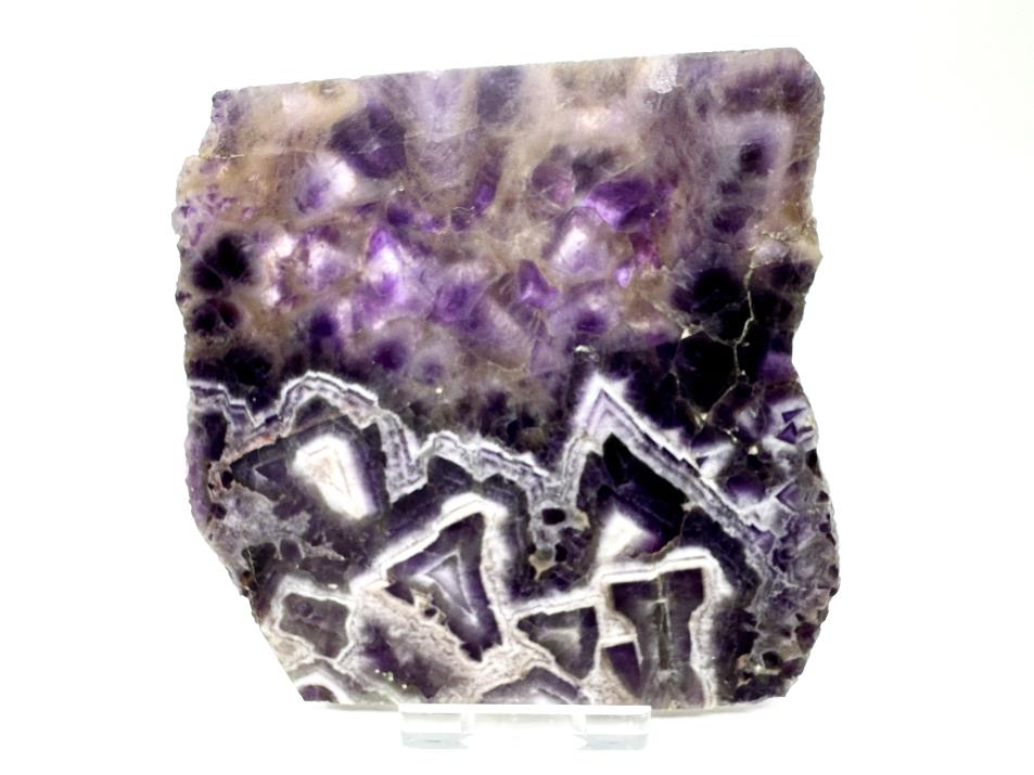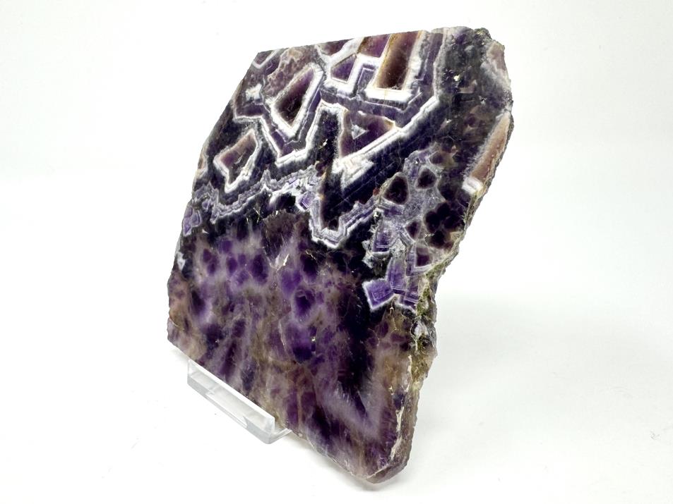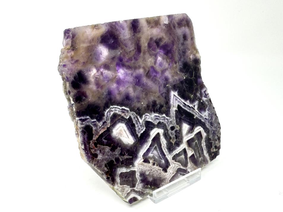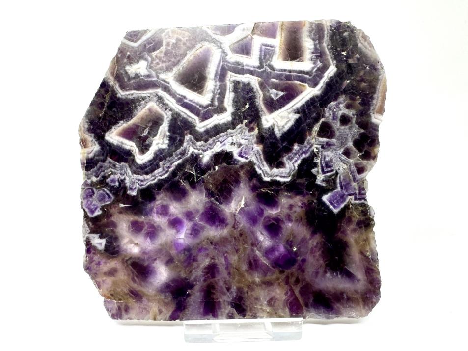 This high-grade purple Chevron Amethyst Slice measures 10.5cm long and displays two polished faces with rough natural edges.