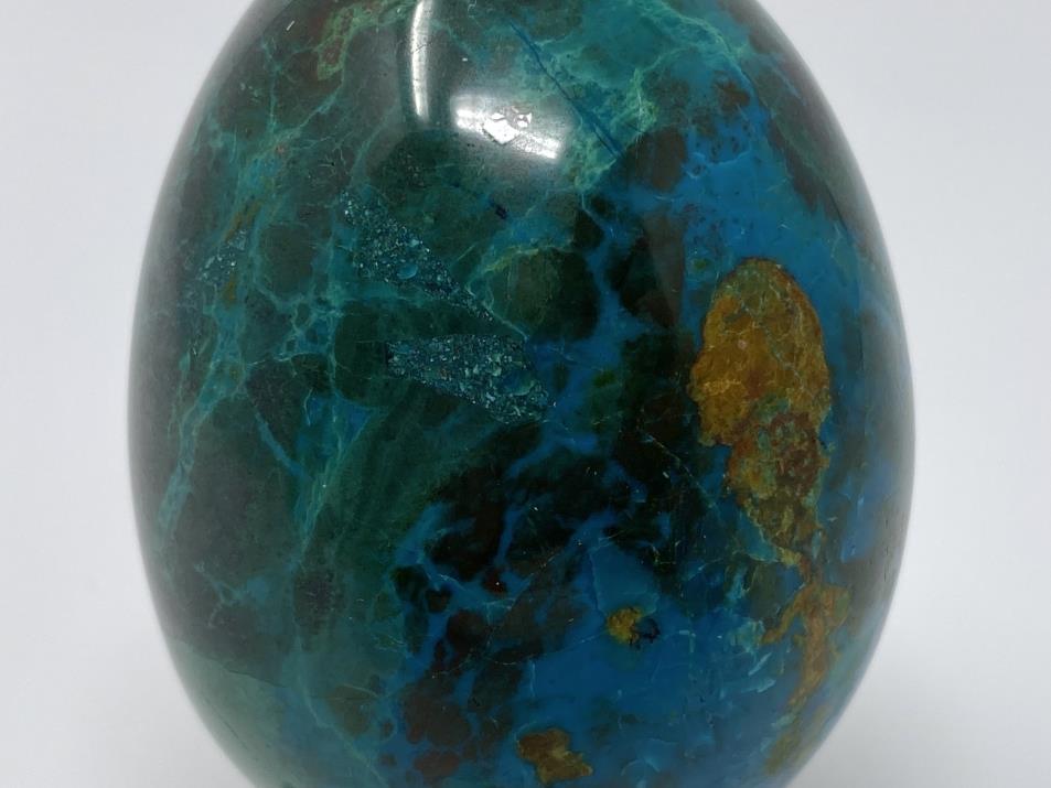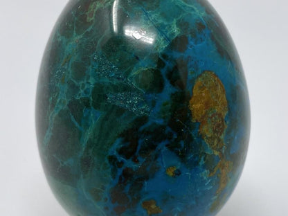 The Natural Chrysocolla Crystal has been carefully cut into a tactile crystal egg shape and hand-polished to create a smooth, Polished Chrysocolla Egg Crystal.
