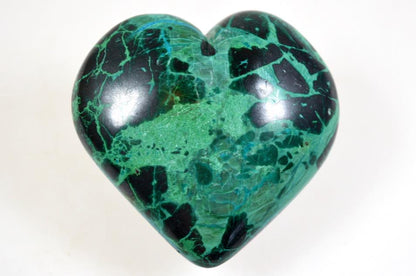 The Natural Chrysocolla Crystal has been carefully cut into a tactile crystal heart shape and hand-polished to create a smooth Polished Chrysocolla Heart Crystal.