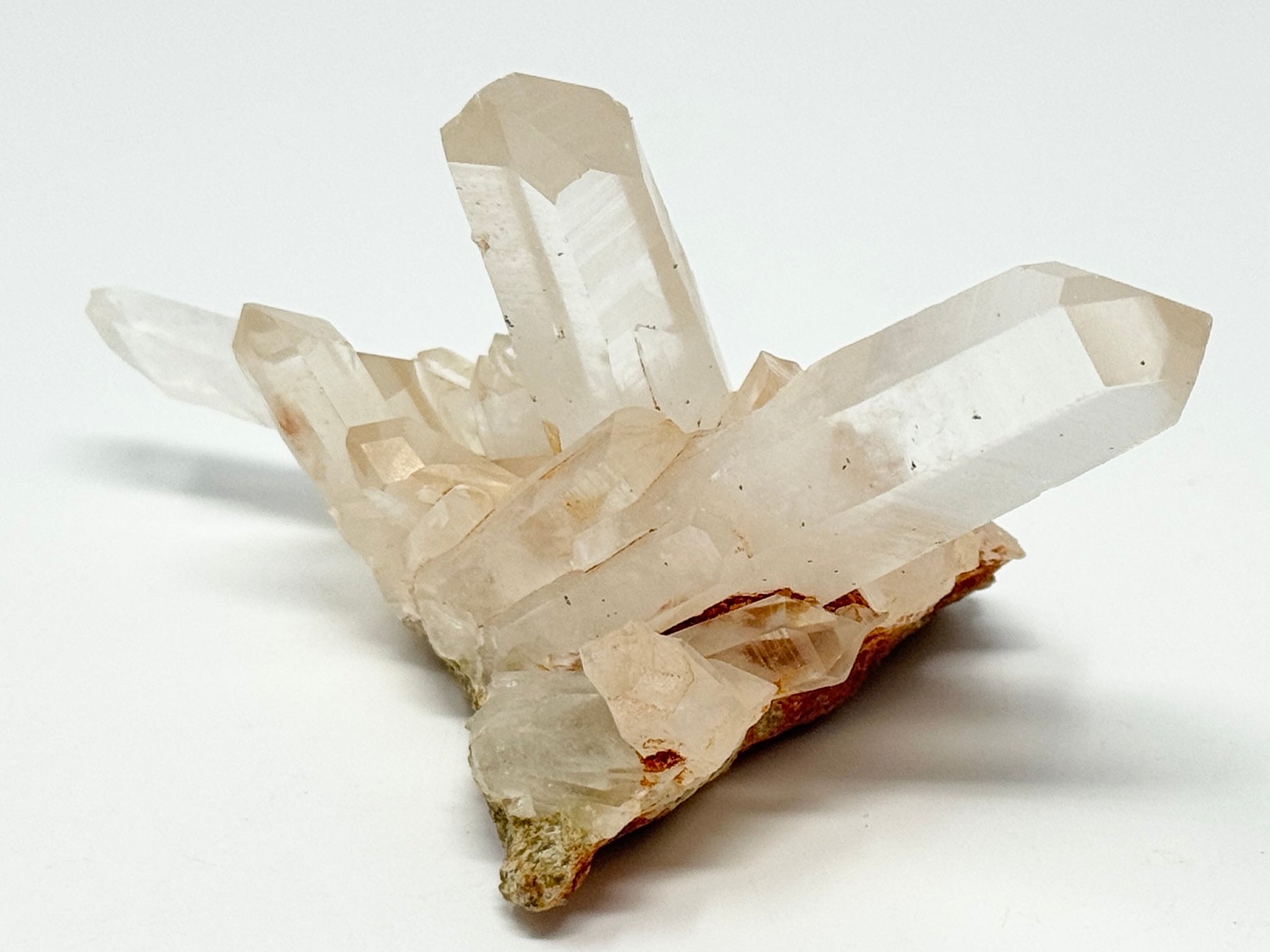This gorgeous Natural Clear Quartz Group measuring 12.3cm long is very bright, clear and vibrant with a natural presence of iron giving a rich orange tone.
