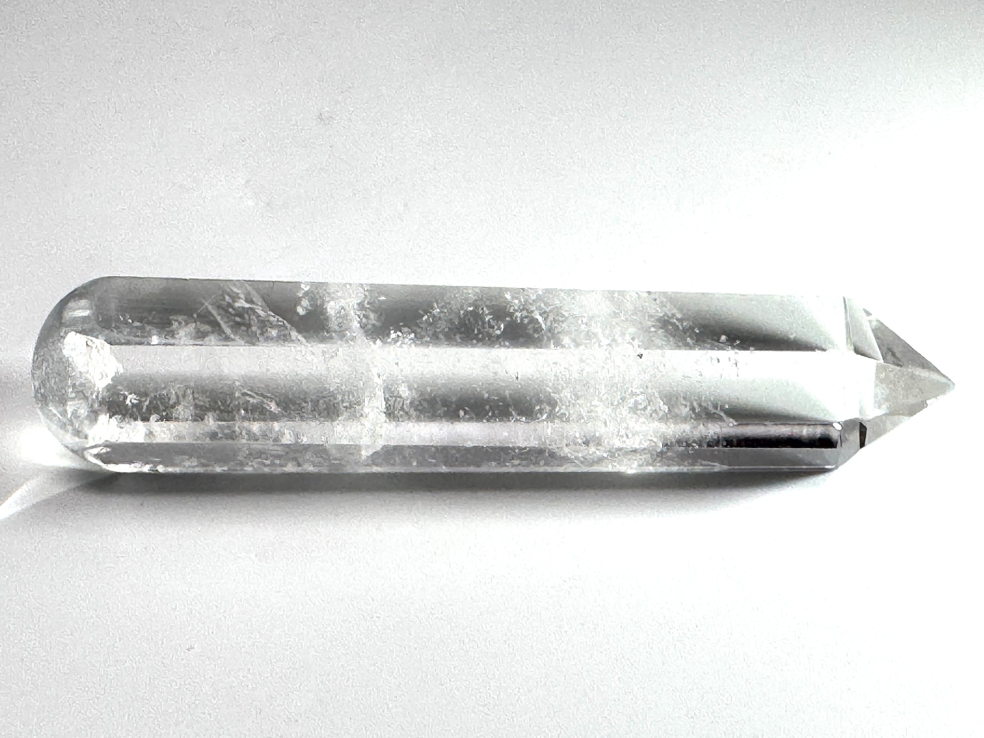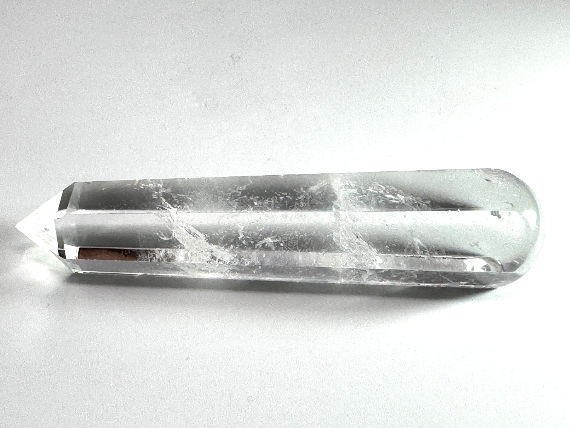 This crystal wand displays a sharp pointed tip at one end, and a rounded hand-polished base at the other end.