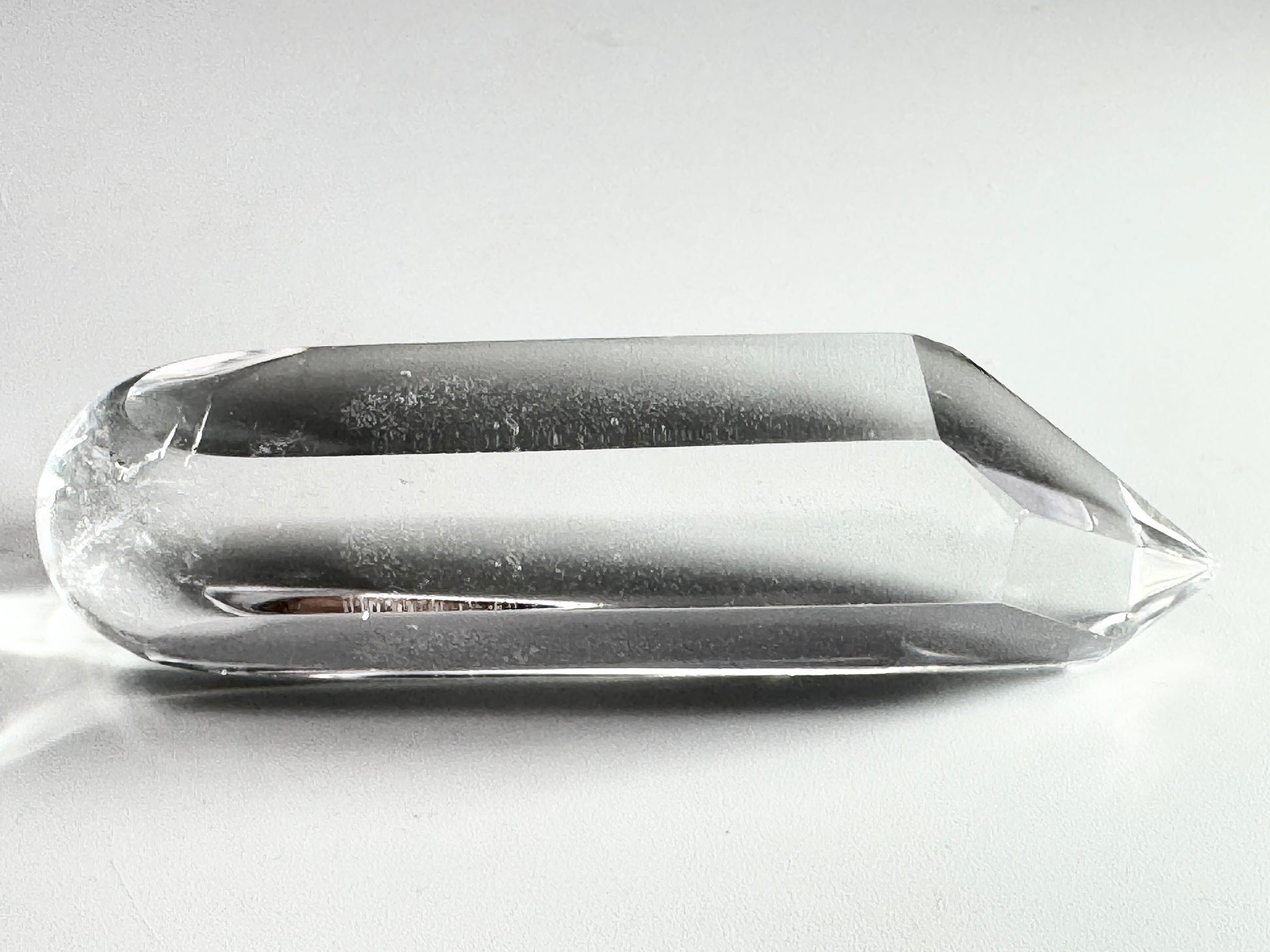 This crystal wand displays a sharp pointed tip at one end, and a rounded hand-polished base at the other end.