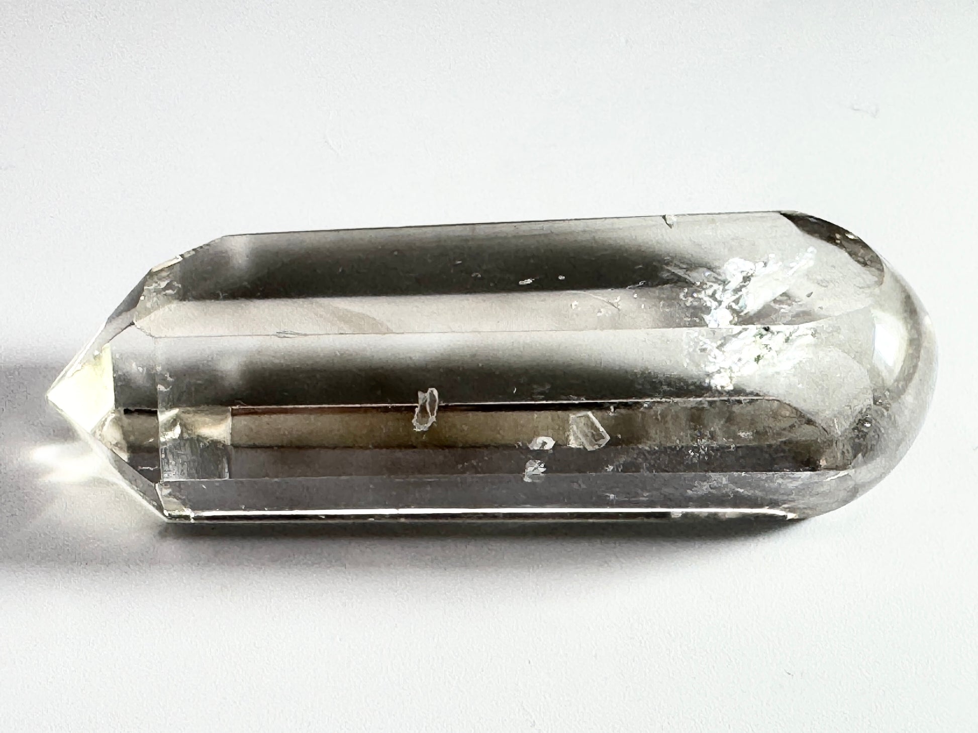 This crystal wand displays a sharp pointed tip at one end, and a rounded hand-polished base at the other end.