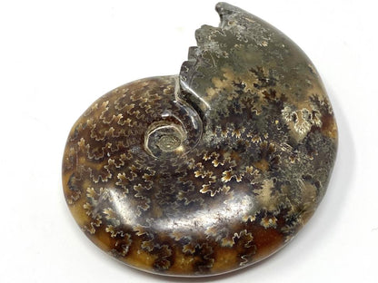 This genuine, real Ammonite Fossil, found in the jungles of Madagascar, has been carefully hand-polished to reveal the beauty of its rich cream-coloured and golden Calcite mineral replacements, as well as its impressive fern-like suture patterns.