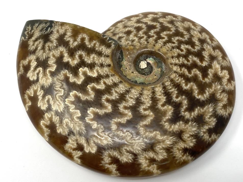 This stunning High-Grade Polished Ammonite Fossil from Madagascar, of the Cleoniceras Ammonite Species, measures 10.2cm wide and displays intricate swirling patterns amongst gorgeous chocolate-brown and caramel-coloured hues.