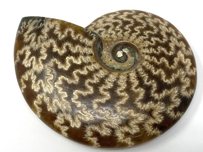 This genuine, real Ammonite Fossil, found in the jungles of Madagascar, has been carefully hand-polished to reveal the beauty of its rich cream-coloured and golden Calcite mineral replacements, as well as its impressive fern-like suture patterns.