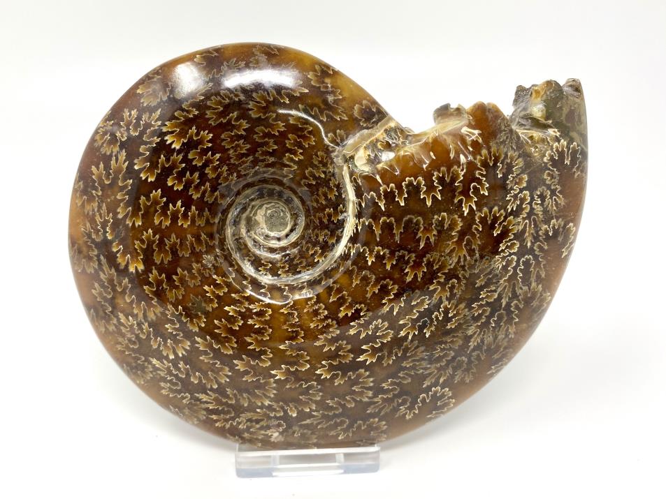 This genuine, real Ammonite Fossil, found in the jungles of Madagascar, has been carefully hand-polished to reveal the beauty of its rich cream-coloured and golden Calcite mineral replacements, as well as its impressive fern-like suture patterns.