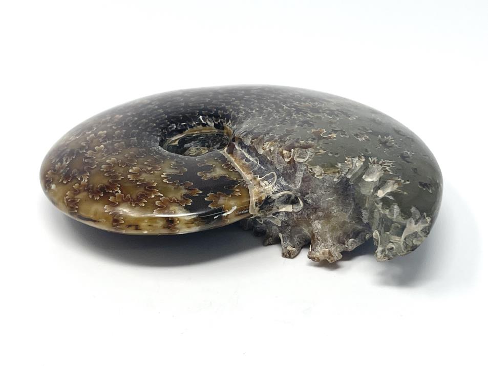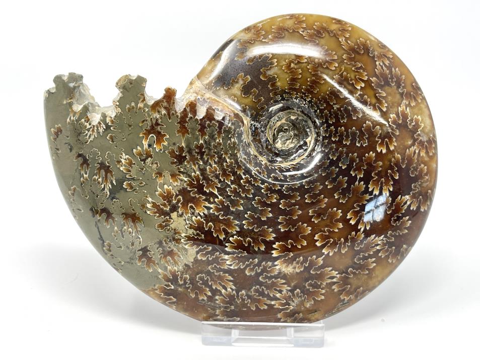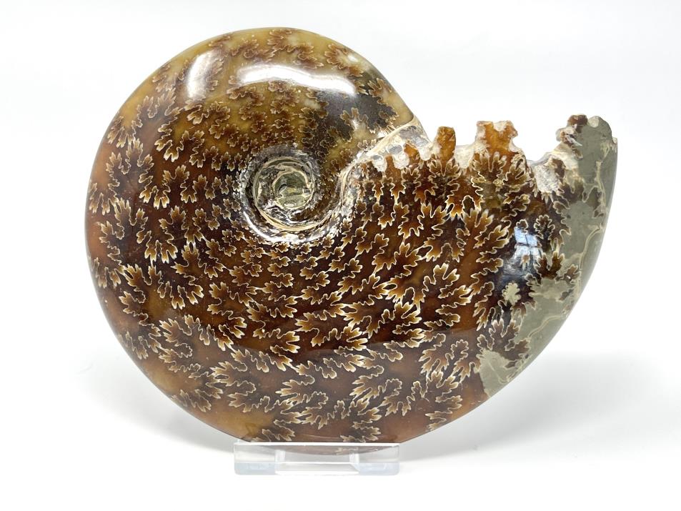 This stunning, high-grade Large Polished Ammonite Fossil from Madagascar, of the Cleoniceras Ammonite Species, measures 13.7cm wide and displays intricate swirling patterns amongst gorgeous chocolate-brown and caramel-coloured hues.