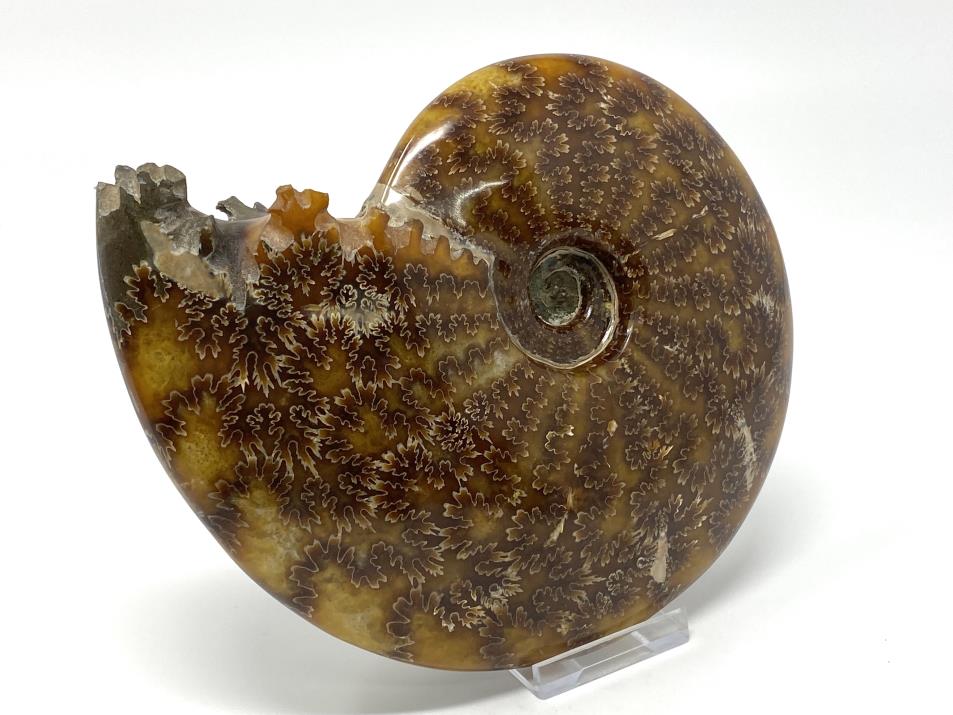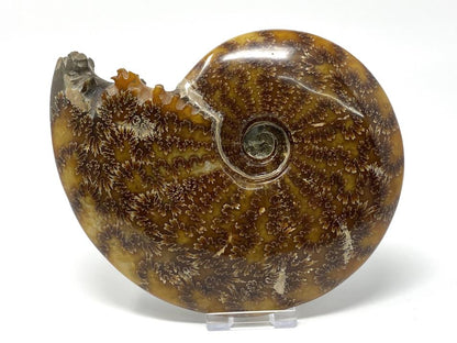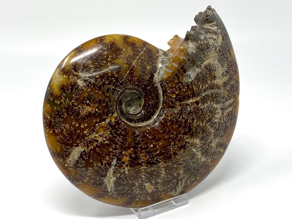 This stunning, high-grade Large Polished Ammonite Fossil from Madagascar, of the Cleoniceras Ammonite Species, measures a magnificent 16.6cm wide and displays intricate swirling patterns amongst gorgeous chocolate-brown and caramel-coloured hues.
