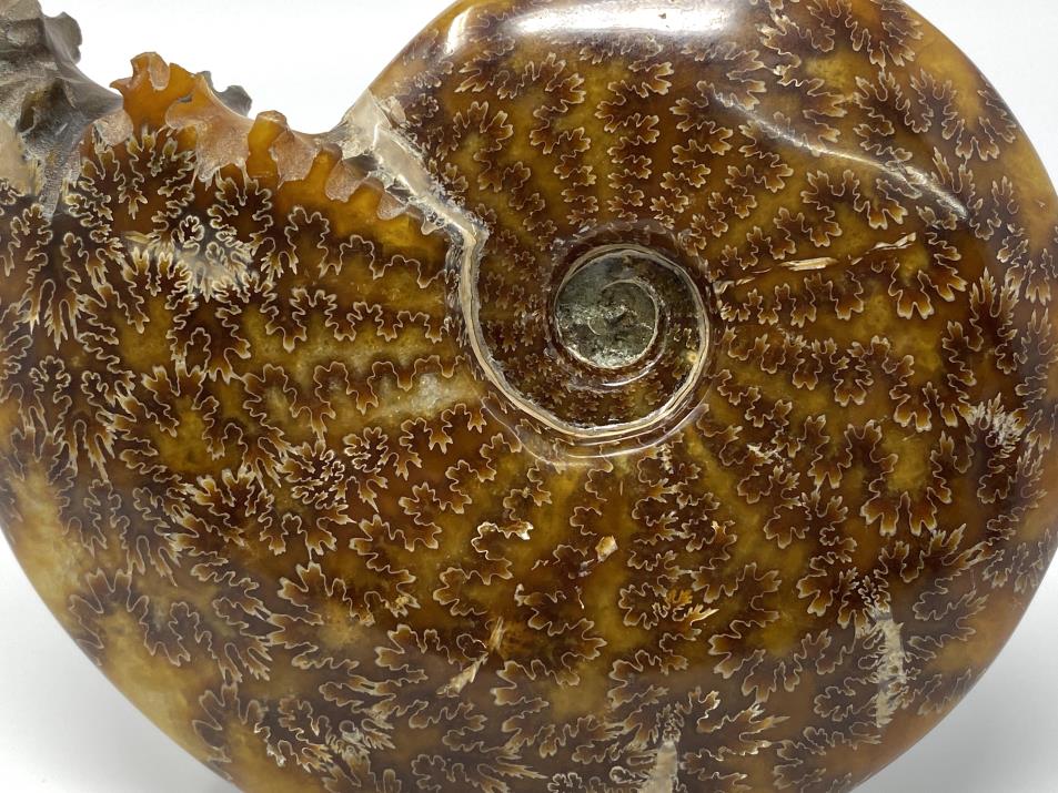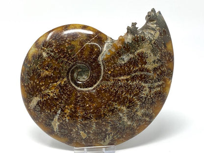 This genuine, real Ammonite Fossil, found in the jungles of Madagascar, has been carefully hand-polished to reveal the beauty of its rich cream-coloured and golden Calcite mineral replacements, as well as its impressive fern-like suture patterns.
