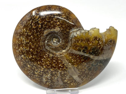 This stunning, high-grade Large Polished Ammonite Fossil from Madagascar, of the Cleoniceras Ammonite Species, measures 12.7cm wide and displays intricate swirling patterns amongst gorgeous chocolate-brown and caramel-coloured hues.
