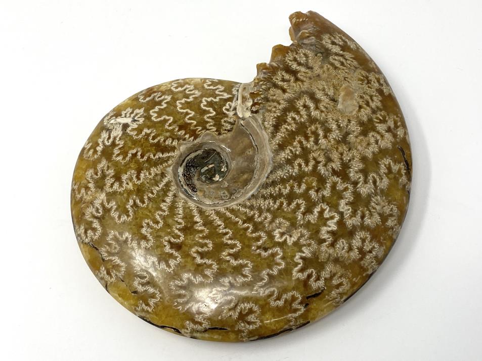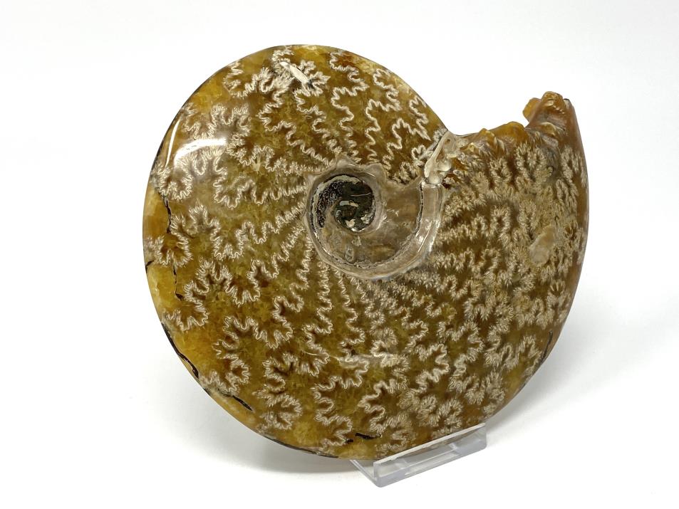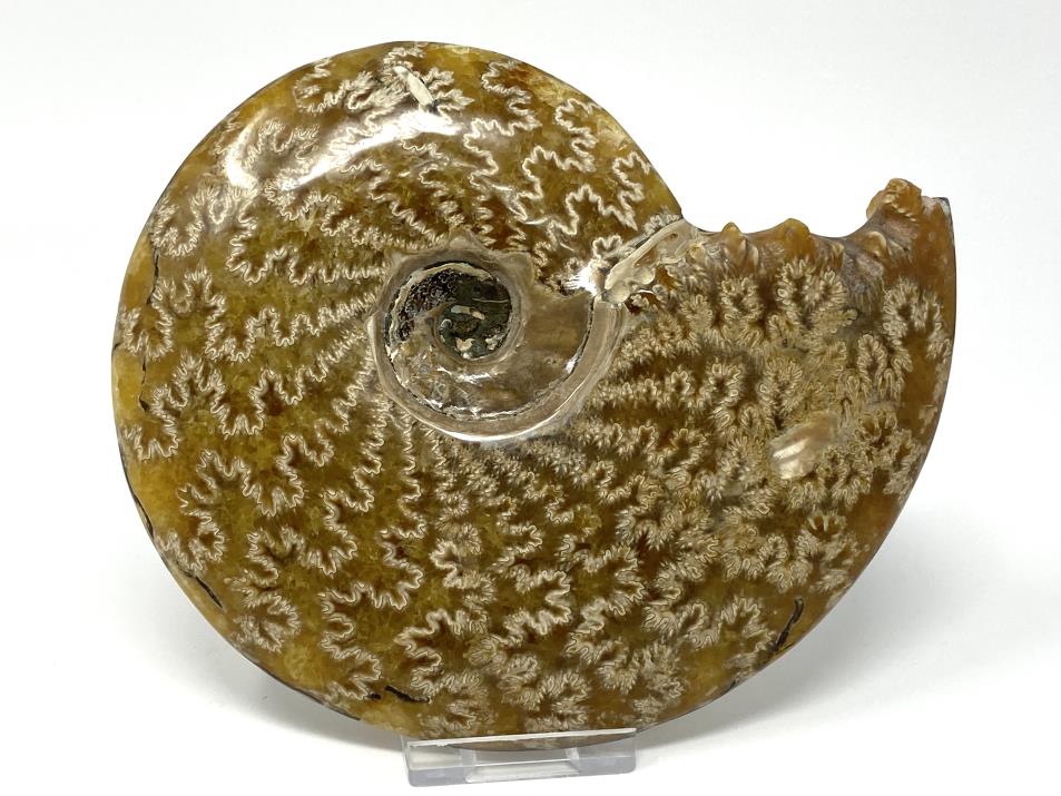 This genuine, real Ammonite Fossil, found in the jungles of Madagascar, has been carefully hand-polished to reveal the beauty of its rich cream-coloured and golden Calcite mineral replacements, as well as its impressive fern-like suture patterns.