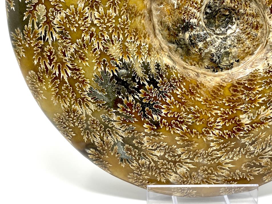 This genuine, real Ammonite Fossil, found in the jungles of Madagascar, has been carefully hand-polished to reveal the beauty of its rich cream-coloured and golden Calcite mineral replacements, as well as its impressive fern-like suture patterns.