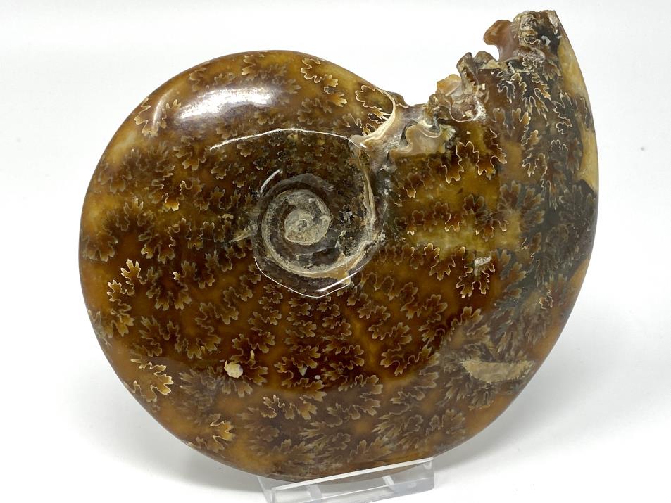 This stunning, high-grade Large Polished Ammonite Fossil from Madagascar, of the Cleoniceras Ammonite Species, measures 14cm wide and displays intricate swirling patterns amongst gorgeous chocolate-brown and caramel-coloured hues.