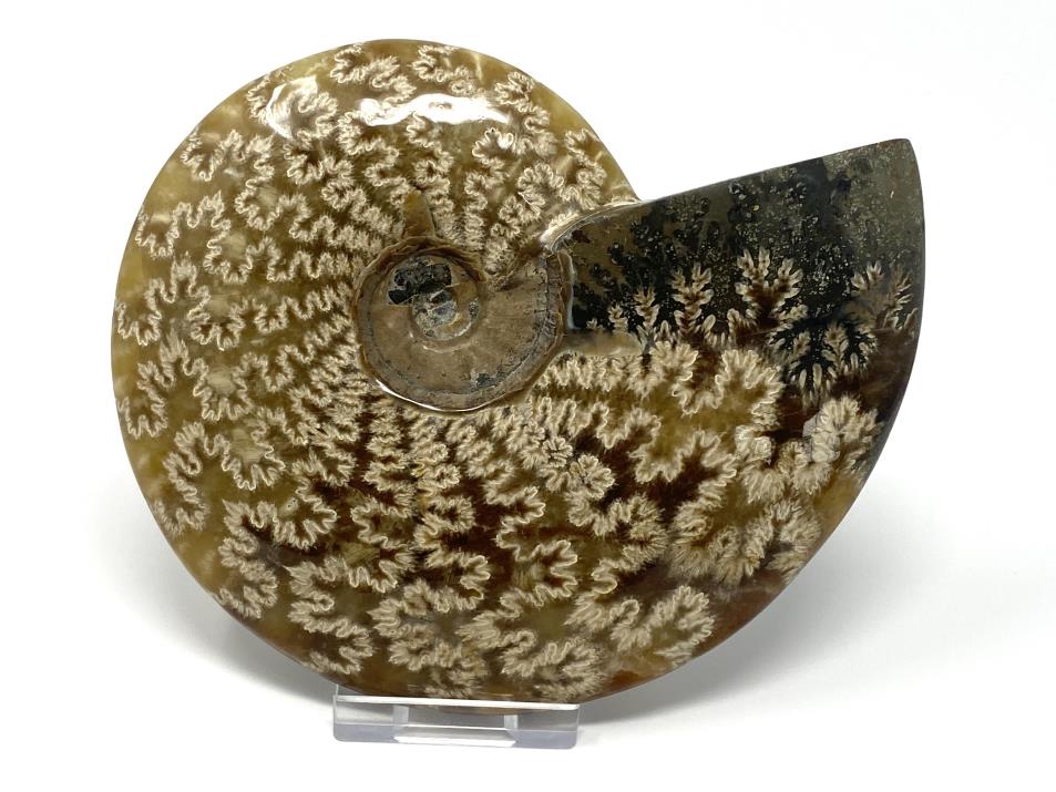 This stunning, high-grade Large Polished Ammonite Fossil from Madagascar, of the Cleoniceras Ammonite Species, measures 14cm wide and displays intricate swirling patterns amongst gorgeous chocolate-brown and caramel-coloured hues.