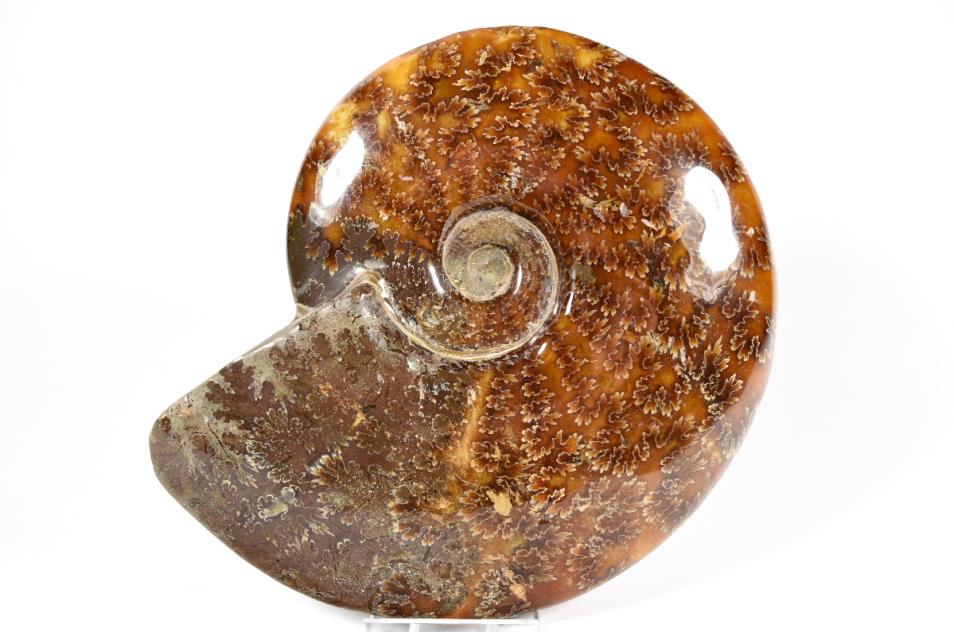 This stunning, high-grade Large Polished Ammonite Fossil from Madagascar, of the Cleoniceras Ammonite Species, measures a magnificent 16.1cm wide and displays intricate swirling patterns amongst gorgeous chocolate-brown and caramel-coloured hues.