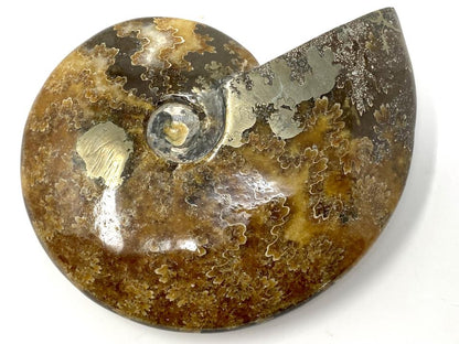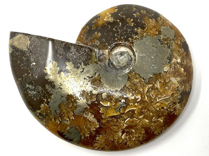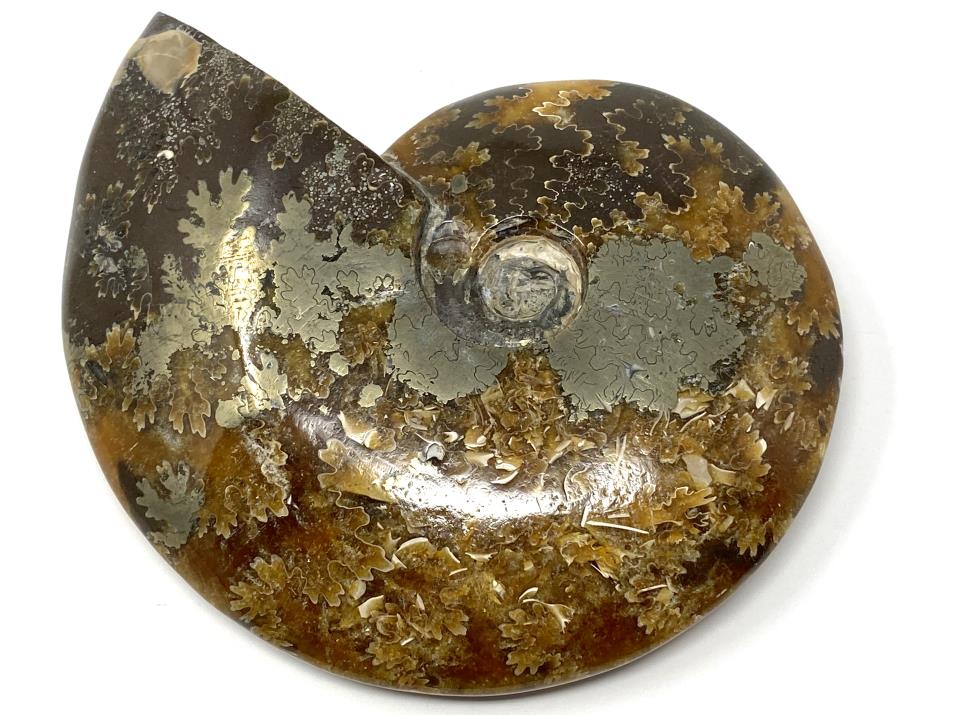 This genuine, real Ammonite Fossil, found in the jungles of Madagascar, has been carefully hand-polished to reveal the beauty of its rich cream-coloured and golden Calcite mineral replacements, as well as its impressive fern-like suture patterns.