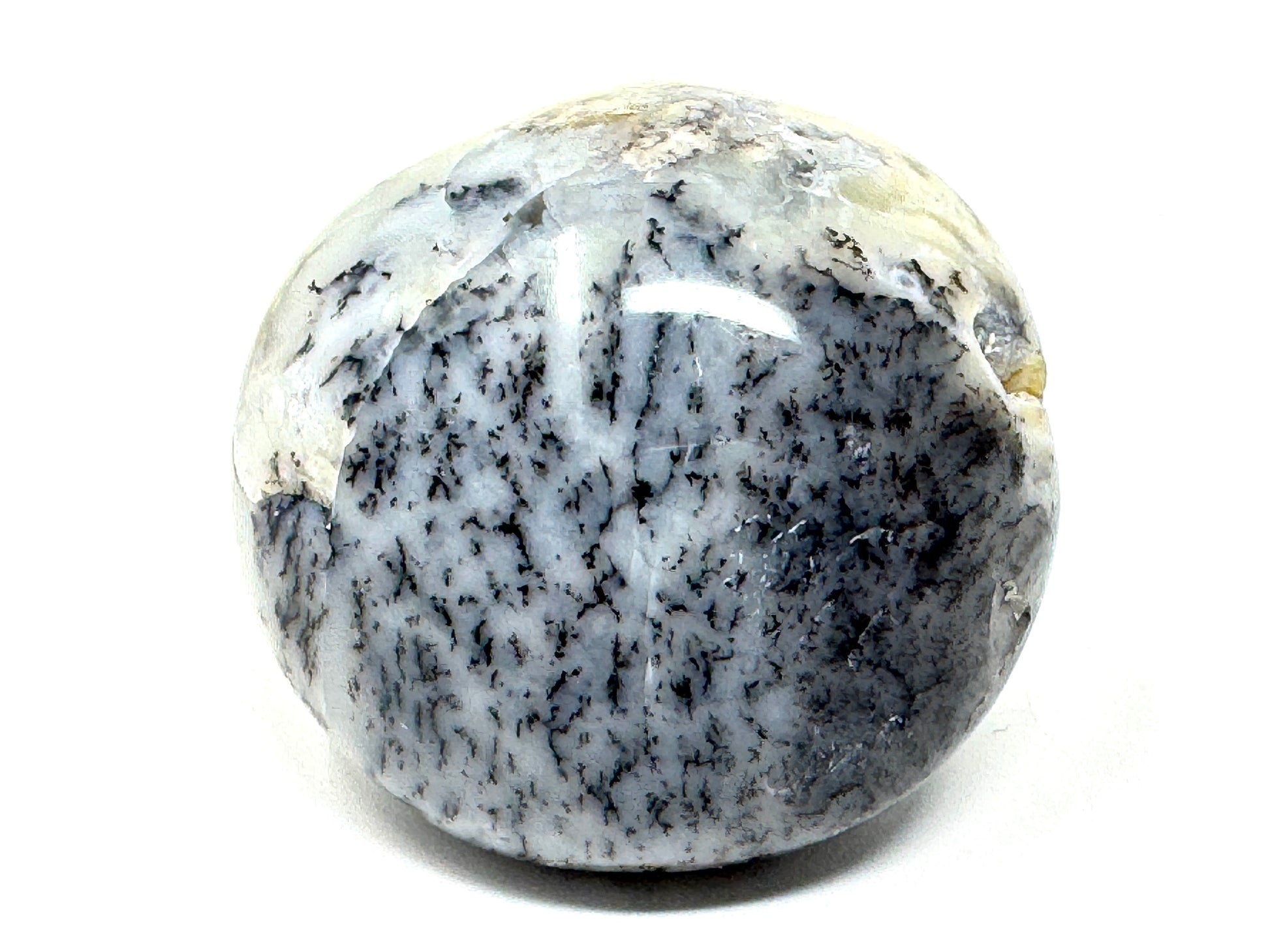 This striking Dendritic Opal Palm Stone (otherwise known as a Dendritic Opal Crystal Pebble or Dendritic Opal Pebble) measures 5cm long and displays gorgeous, unique, tree-like dendritic patterns.