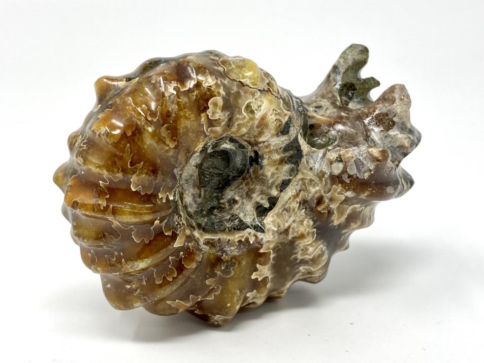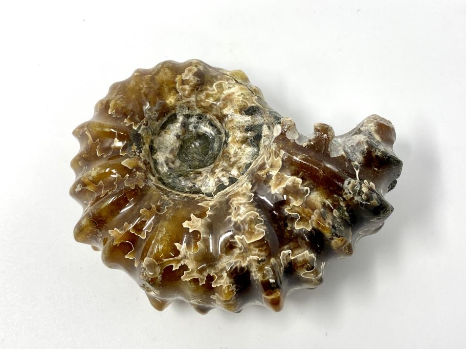 This stunning High-Grade Polished Ammonite Fossil from Madagascar, of the Douvilleiceras Ammonite Species, measures 7.4cm wide and has been carefully polished on top of its fossilised shell, which displays gorgeous chocolate brown, caramel-coloured, and cream suture patterns.