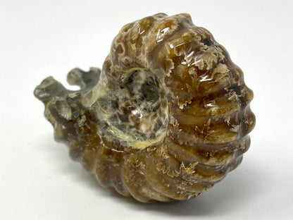 This stunning High-Grade Polished Ammonite Fossil from Madagascar, of the Douvilleiceras Ammonite Species, measures 6.2cm wide and has been carefully polished on top of its fossilised shell, which displays gorgeous chocolate brown, caramel-coloured, and cream suture patterns.