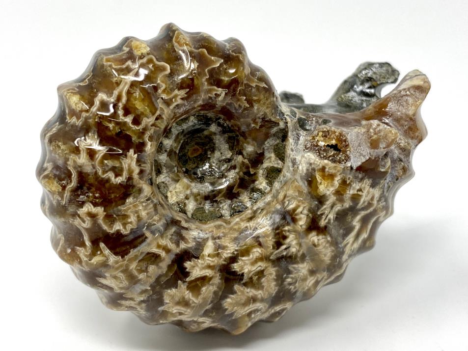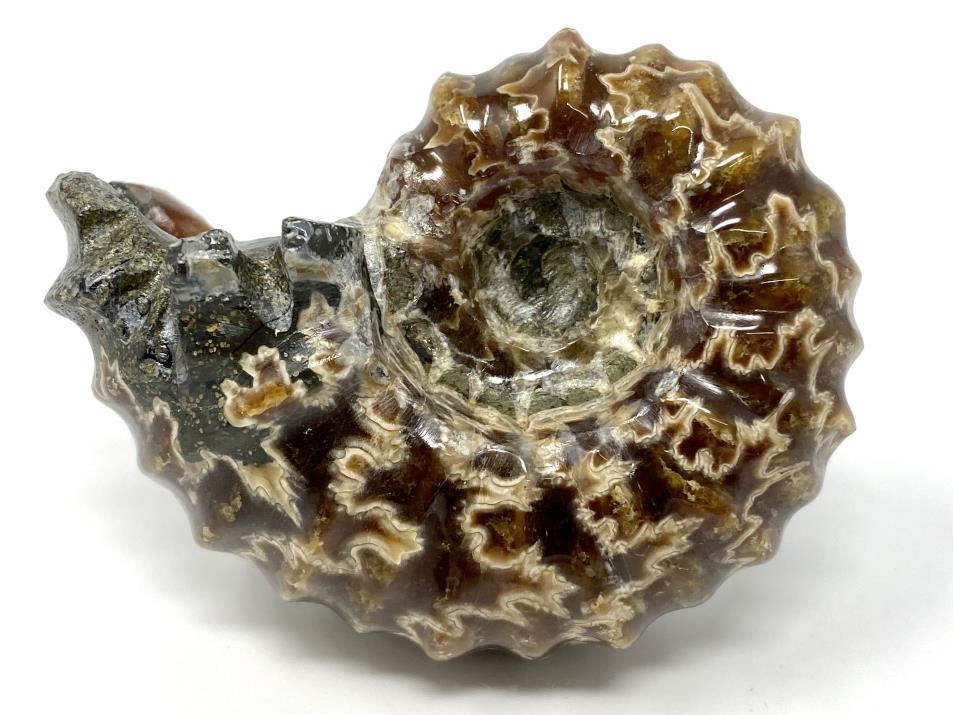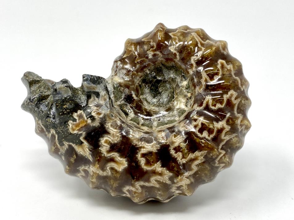 This stunning High-Grade Polished Ammonite Fossil from Madagascar, of the Douvilleiceras Ammonite Species, measures 6.5cm wide and has been carefully polished on top of its fossilised shell, which displays gorgeous chocolate brown, caramel-coloured, and cream suture patterns.
