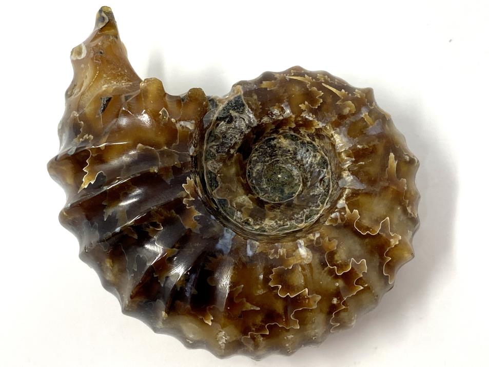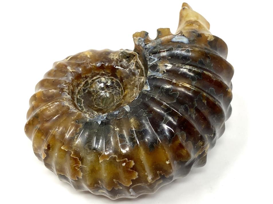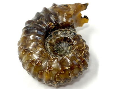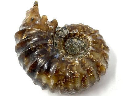 This stunning High-Grade Polished Ammonite Fossil from Madagascar, of the Douvilleiceras Ammonite Species, measures 7cm wide and has been carefully polished on top of its fossilised shell, which displays gorgeous chocolate brown, caramel-coloured, and cream suture patterns.