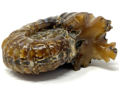 This genuine, real Ammonite Fossil, found in the jungles of Madagascar, has been carefully hand-polished to reveal the beauty of its rich golden Calcite mineral replacements, as well as its impressive fern-like suture patterns.