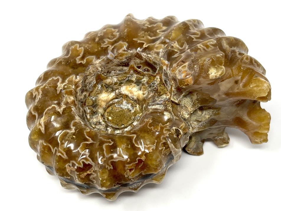 This stunning High-Grade Polished Ammonite Fossil from Madagascar, of the Douvilleiceras Ammonite Species, measures 7.8cm wide and has been carefully polished on top of its fossilised shell, which displays gorgeous chocolate brown, caramel-coloured, and cream suture patterns.
