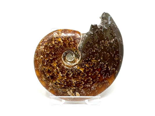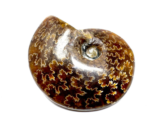 This genuine, real Ammonite Fossil, found in the jungles of Madagascar, has been carefully hand-polished to reveal the beauty of its rich golden Calcite mineral replacements, as well as its impressive fern-like suture patterns.