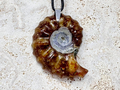 This high-grade, hand-made, polished Douvilleiceras Ammonite Pendant was made from a real Douvilleiceras Ammonite Fossil from Madagascar and measures 5cm long, displaying a hand-polished fossilised shell with an exposed mouth which has been prepared by hand along its suture lines.