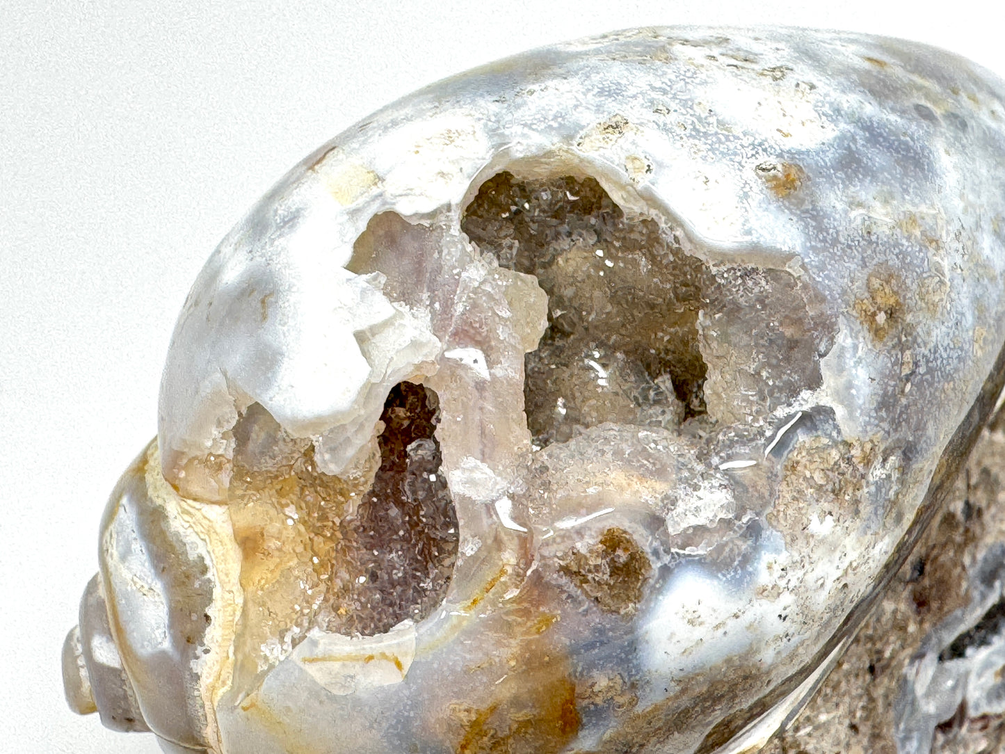 The colours and sleek, smooth polish of the Chalcedony Replaced Gastropod Fossil Shell contrast marvellously against large natural crystal cavities full of clear and white sparkling druzy Quartz crystals.