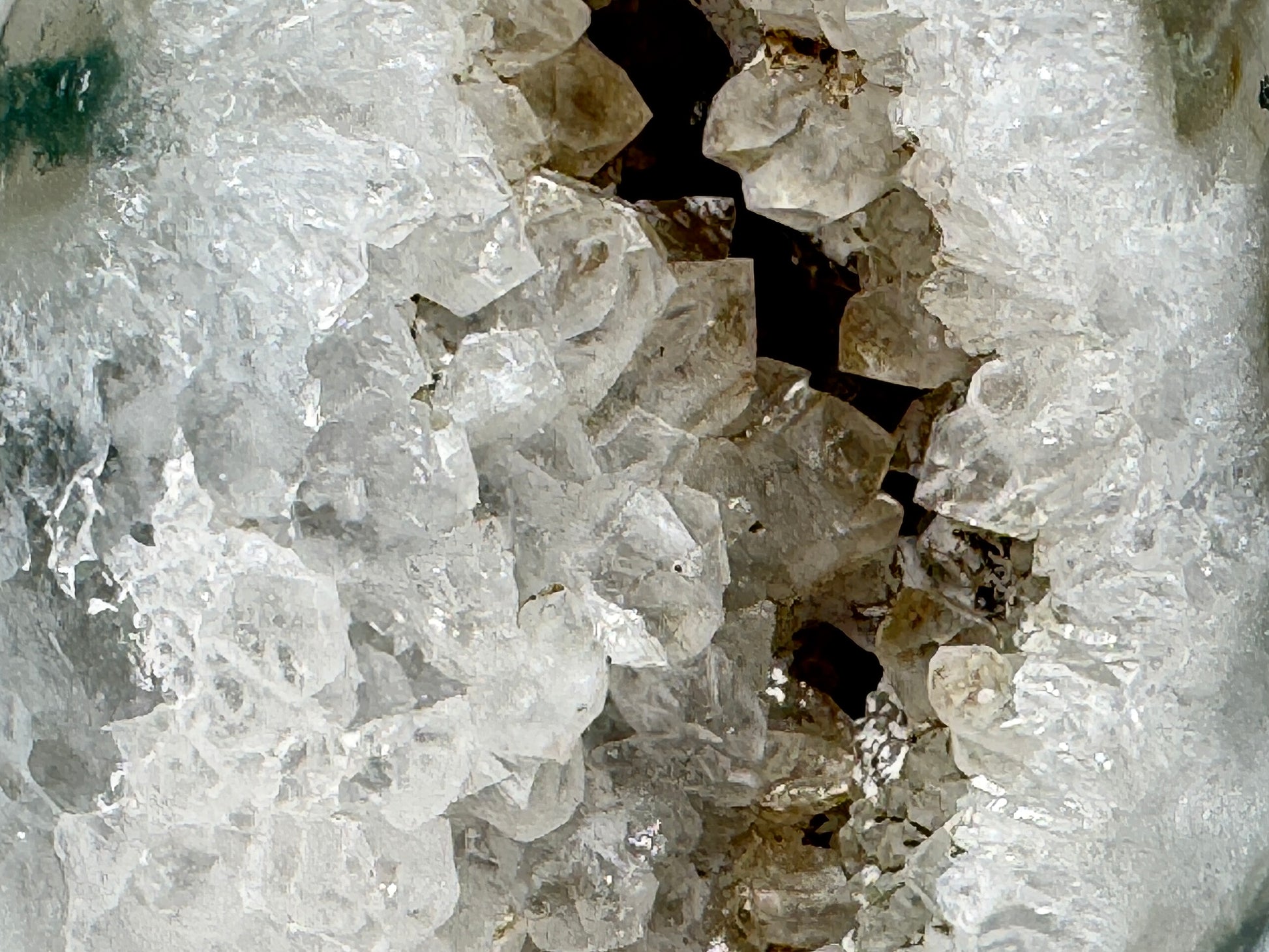 This piece also displays large sections of Clear Quartz Crystals, including natural crystal cavities lined with sparkling Druzy Crystals.