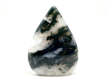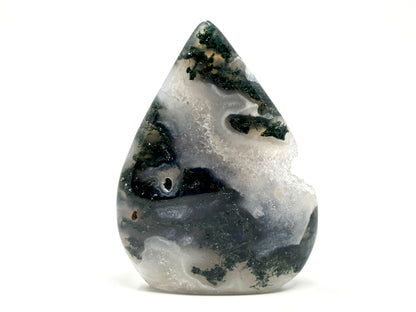 This Druzy Moss Agate Free Shape showcases stunning milky White Quartz/ White Agate and gorgeous translucent Blue-Grey Agate/ Blue-Grey Chalcedony adorned with dark and verdant green tree-like, moss-like dendritic patterns.