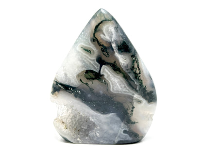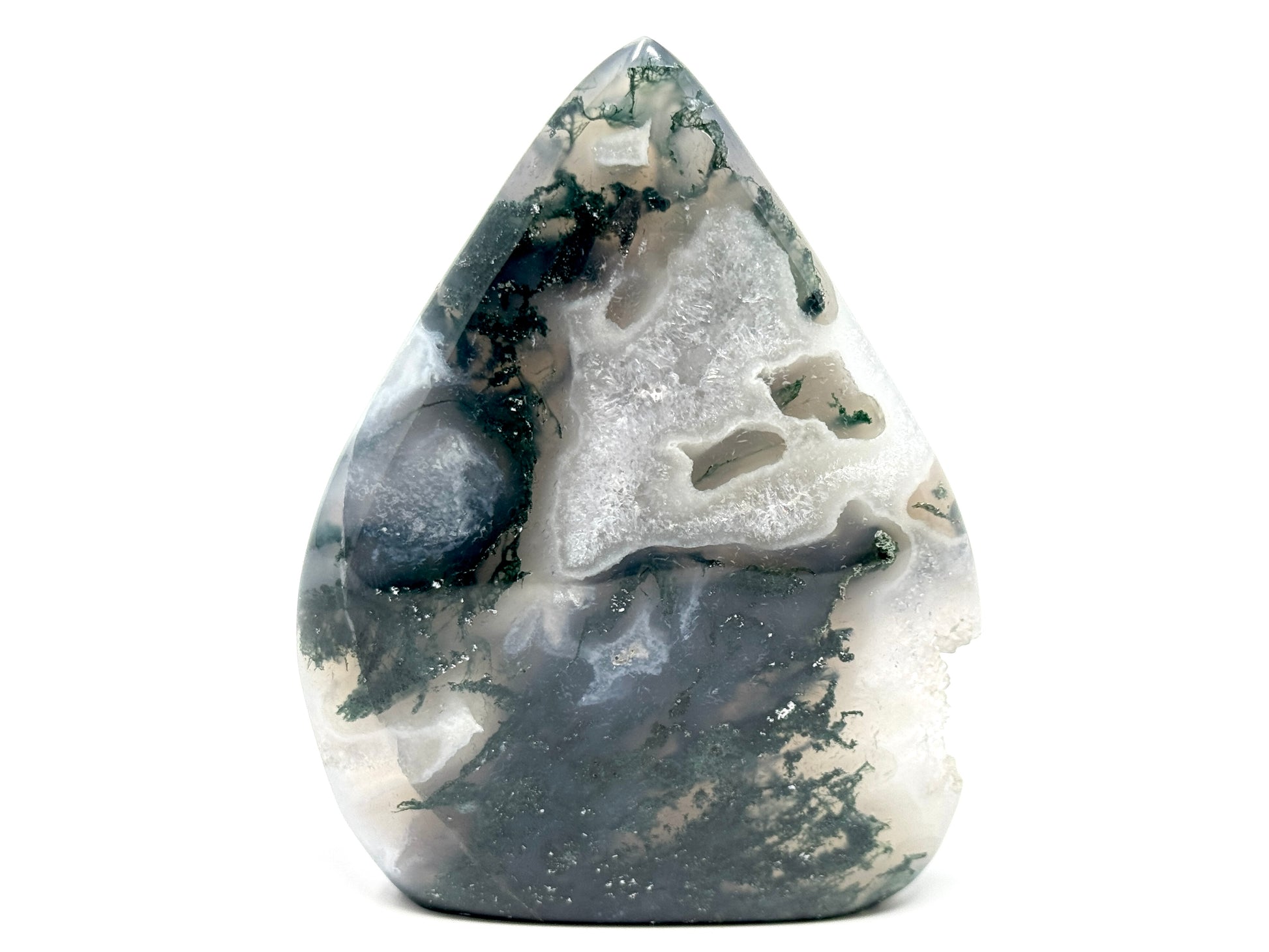 This gorgeous Druzy Moss Agate Crystal Freeform (also known as a Druzy Tree Agate Crystal Freeform) measuring 11.1cm tall has been carefully cut and polished from Green Moss Agate Stone (also known as Tree Agate Stone) into a Free-Standing Crystal Freeform Shape.