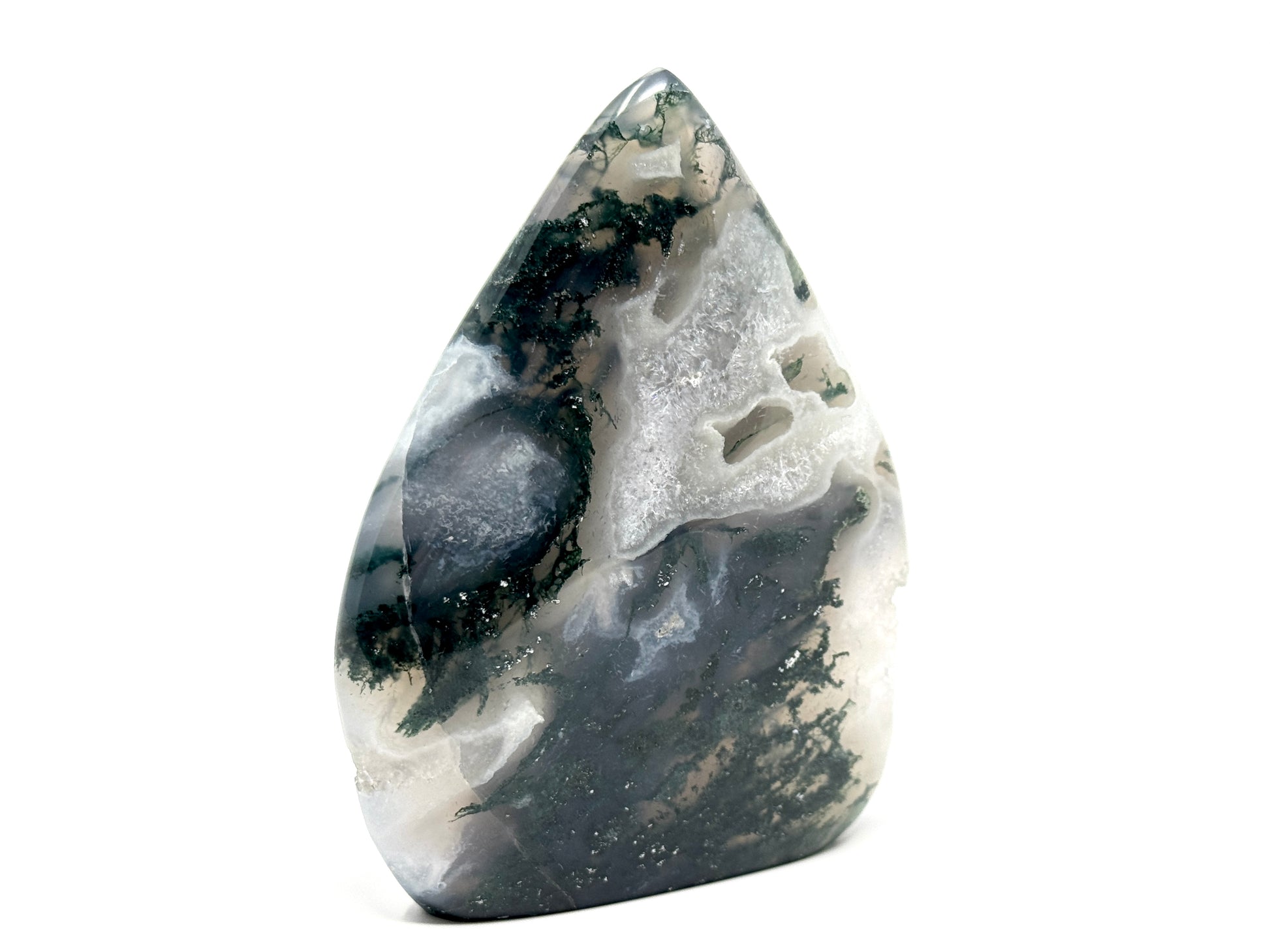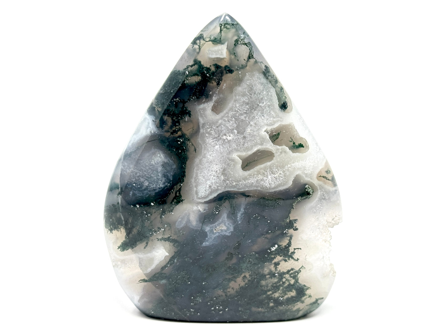 This Druzy Moss Agate Free Shape showcases stunning milky White Quartz/ White Agate and gorgeous translucent Blue-Grey Agate/ Blue-Grey Chalcedony adorned with dark and verdant green tree-like, moss-like dendritic patterns.