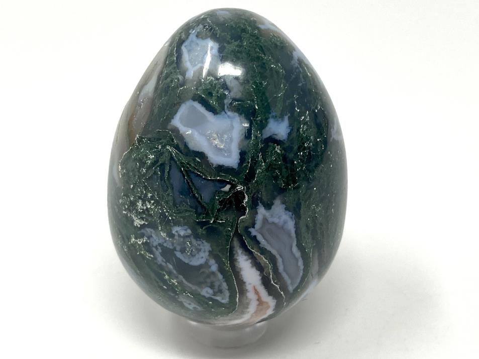 This Druzy Moss Agate Egg showcases stunning milky White Quartz/ White Agate and gorgeous translucent Blue-Grey Agate/ Blue-Grey Chalcedony adorned with dark and verdant green tree-like, moss-like dendritic patterns.