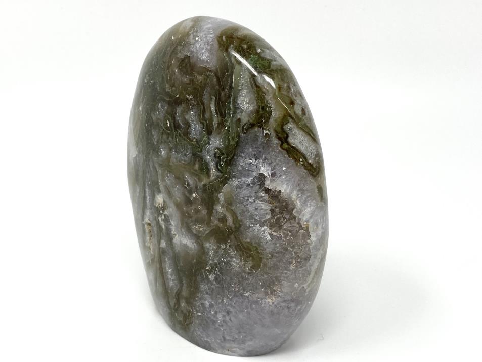 This gorgeous Druzy Moss Agate Crystal Freeform (also known as a Druzy Tree Agate Crystal Freeform) measuring 12cm tall has been carefully cut and polished into a crystal freeform shape, with a free-standing base and soft, curved shape, from Green Moss Agate Stone.