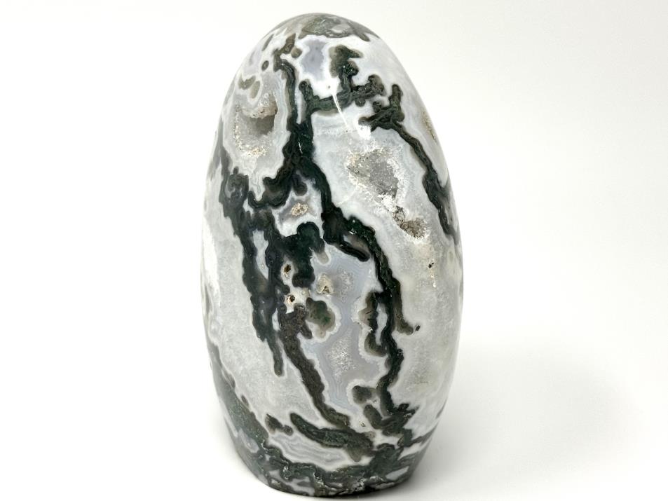 This gorgeous Large Druzy Moss Agate Crystal Freeform (also known as a Large Druzy Tree Agate Crystal Freeform) measuring 12.5cm tall has been carefully cut and polished into a crystal freeform shape, with a free-standing base and soft, curved shape, from Green Moss Agate Stone.